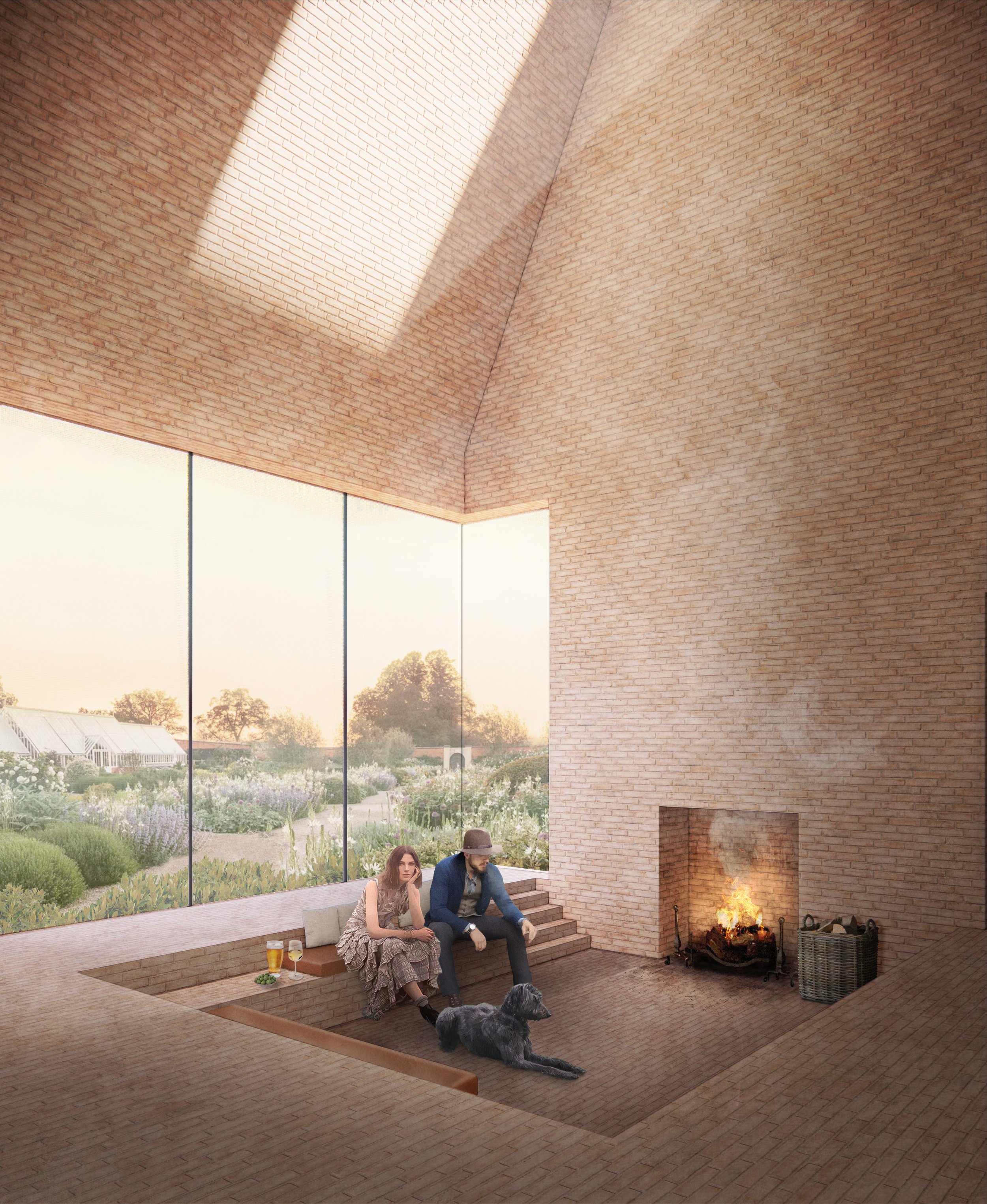 The scheme is expressed as five distinctive elements centred around a planted courtyard and kitchen garden, taking its inspiration from medieval hamlets or farmsteads. The tallest element is the roof to the hearth with its chimney smoking over the treetops, a signal to a place of repose.