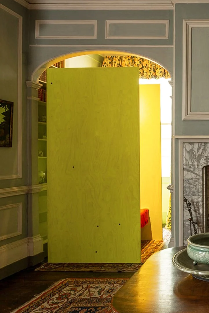 The focal point of the installation is a statement of inverted authority, a colonnade of arches built with discarded materials salvaged from former exhibitions and stage sets.